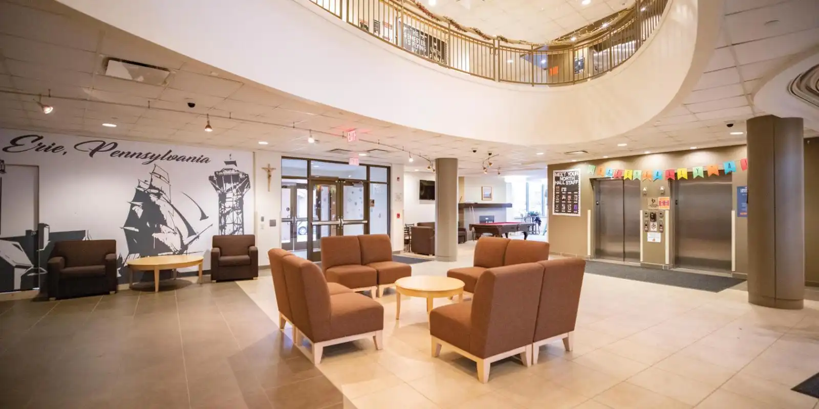 main lobby lounge with large screen television, billiards tables and information desk